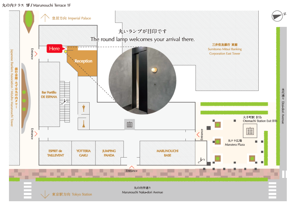 丸の内テラス1F奥に丸いランプが点灯している自動ドアをお進み下さい。